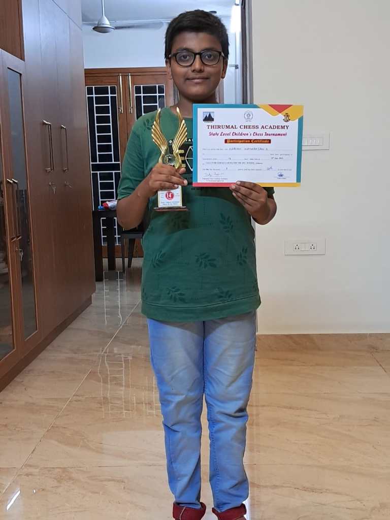 Harish scored 5 /7 and placed 14th in state level childrens chess tournament conducted by thirumal chess academy ON 29/01/2023