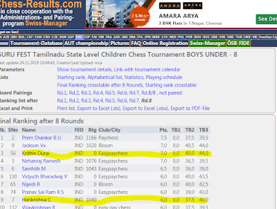 Harikrishnascored 6/8 and secured 9th Place in U-8 Boys